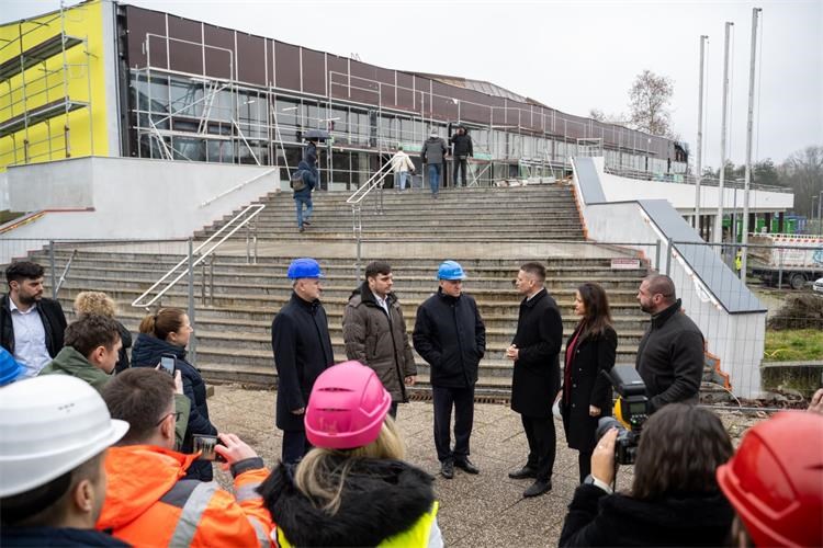 Minister Bačić then toured the construction site of energy renovation of the Sisak Sports and Recreation Centre, i.e. the indoor swimming pool with a gross building area of 9,910.00 square metres. The total worth of the contract is 11.35 million euro, PDV included, whereby grants allocated from the Recovery and Resilience Mechanism, secured through a tender by the Ministry of Construction and APN, is 2.45 million euro.